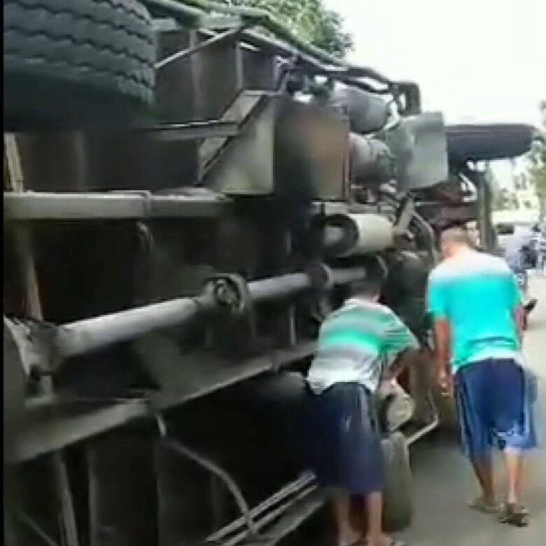Truk itu terguling akibat kecelakaan tunggal. Tidak ada kendaraan yang terlibat selain Truk Fuso dengan Nopol DR 8575 AD itu.